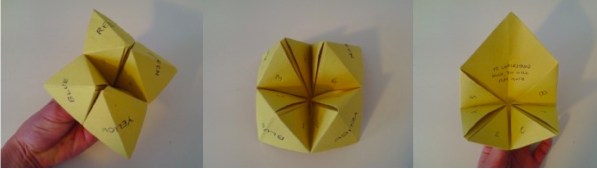 I see that many of you have started to fool around with the paper fortune tellers sprinkled around the room. When I told my teen coworkers that this session was at the end of the Summit, they thought you might need something playful to do. They folded these “cootie-catchers”– as I used to call them as a kid– for you.